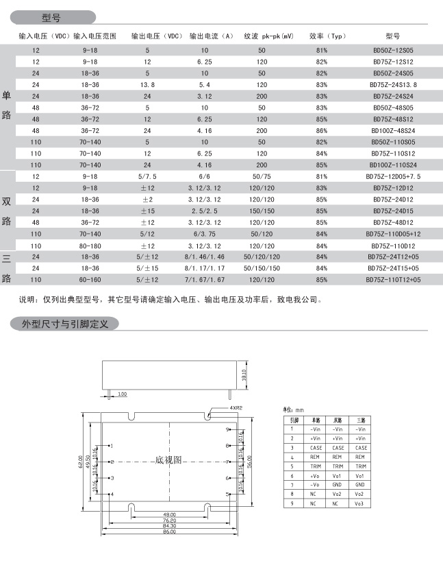 功率:30-100W 輸入電壓:9-18VDC 18-36VDC 36-72VDC 70-140VDC 200-400VDC 輸出路數:單路 雙路 三路 外形尺寸:86*62*18.1mm 安裝方式:引針式
